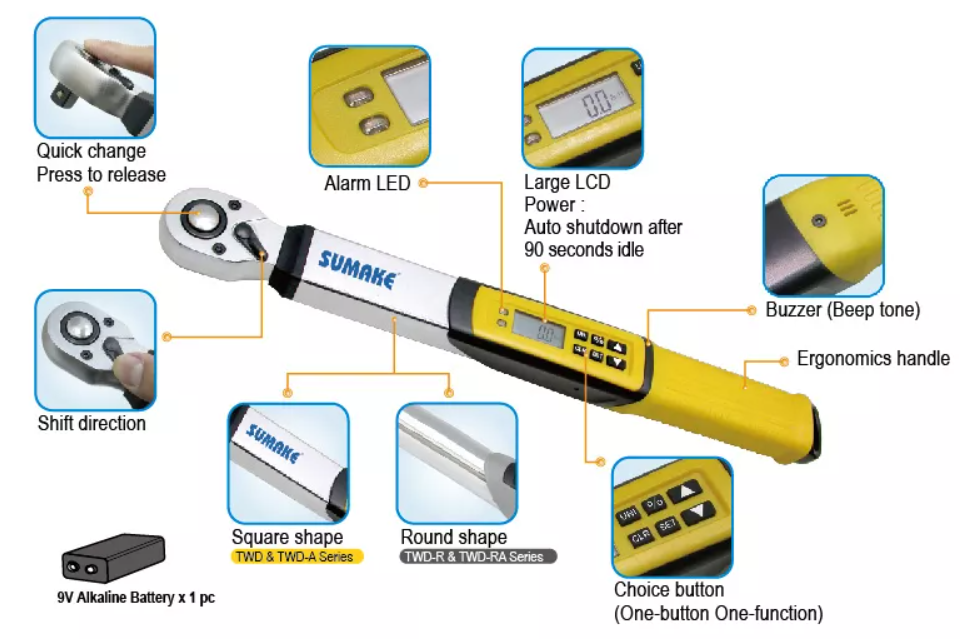 Một cờ lê mô-men xoắn kỹ thuật số đơn giản để sử dụng với Màn hình LCD kỹ thuật số dễ đọc được tích hợp trong bất kỳ 3 đơn vị mô-men xoắn nào; Nm; Ft-lbs; tính bằng lbs.